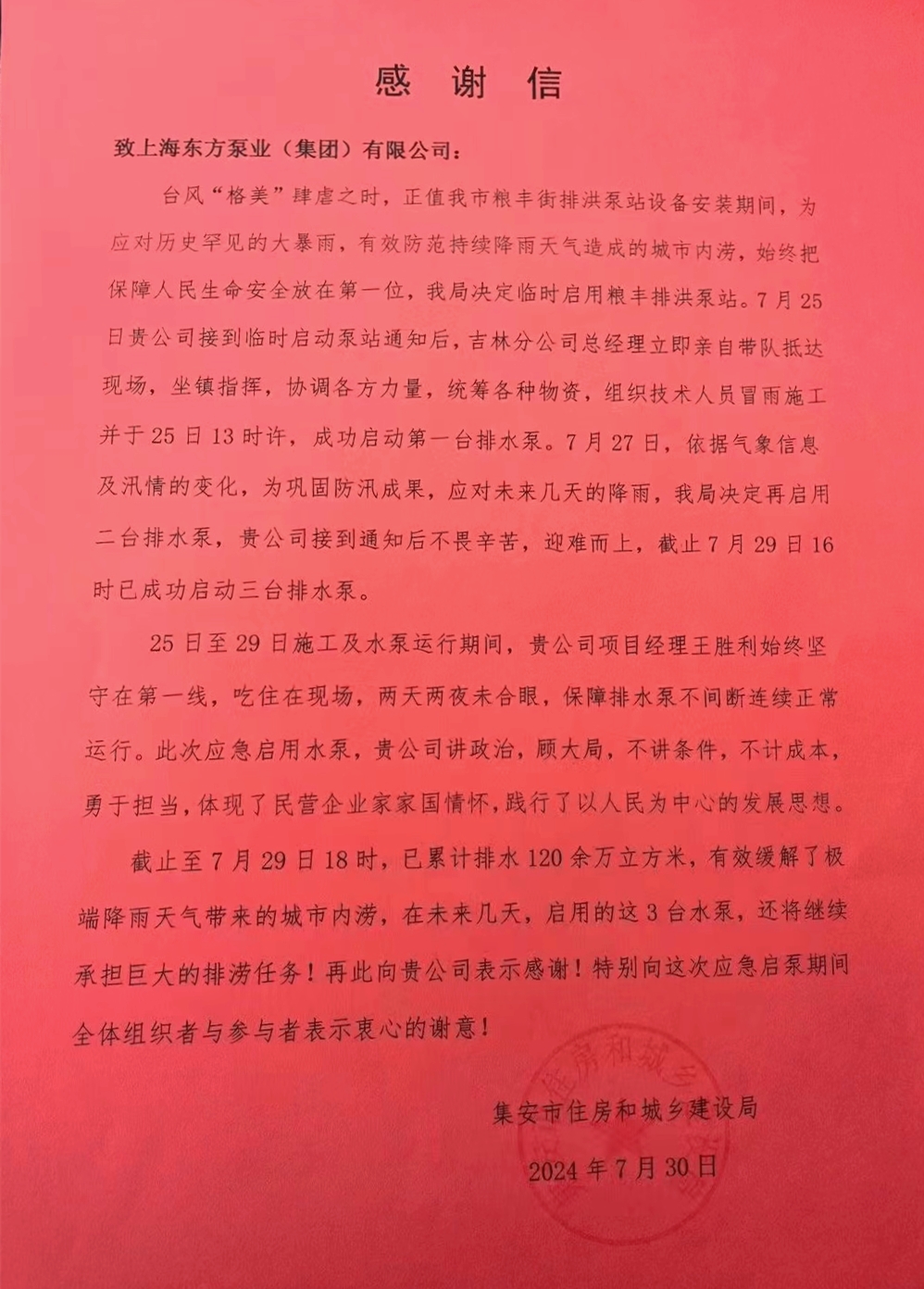 感谢信内容信中提到,在台风“格美”带来的历史罕见暴雨期间,集安市粮丰街排洪泵站正处于设备安装阶段。为了防范持续降雨可能造成的城市内涝,集安市住建局决定临时启用粮丰排洪泵站。接到通知后,AG真人国际吉林分公司总经理立即亲临现场坐镇指挥,组织技术人员冒雨施工,于7月25日13时成功启动第一台排水泵。随着气象信息和汛情的变化,AG真人国际再次接到了启动第二台和第三台排水泵的通知,AG真人人不畏困难,迎难而上,截至7月29日16时已成功启动三台排水泵。